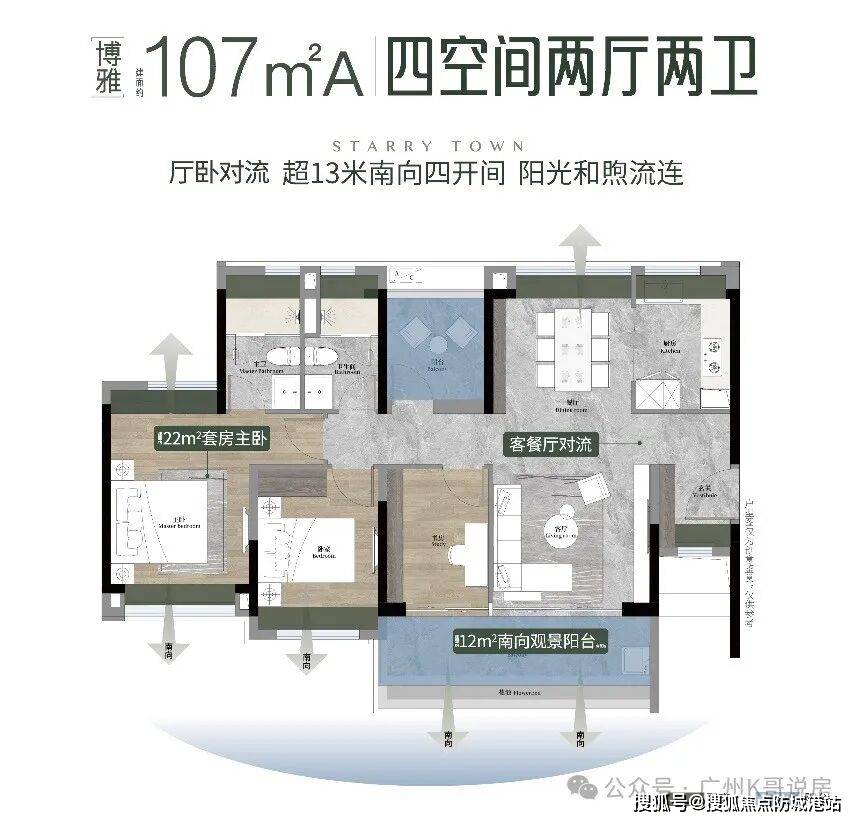【107㎡A 4空间2厅2卫】:该户型为改善型户型,配置南向观景玄关,入户即见美景,仪式感十足,提升居住格调。户型采用4.5开间朝南设计,客厅、主卧双南北对流,通风效果极佳,室内空气流通顺畅,有效改善室内空气质量,提升居住舒适度。畅享双面宽观景阳台,视野开阔,能够俯瞰社区景观和周边美景,同时,飘窗拓宽了功能空间,增加了使用面积,可根据需求改造为休闲区、储物区或书桌,实用性强。交互式方厅设计,可开可合,灵活多变,能够满足家人不同的使用需求,无论是日常起居、休闲娱乐还是接待亲友,都能轻松应对,适合三口之家或二胎家庭居住。
