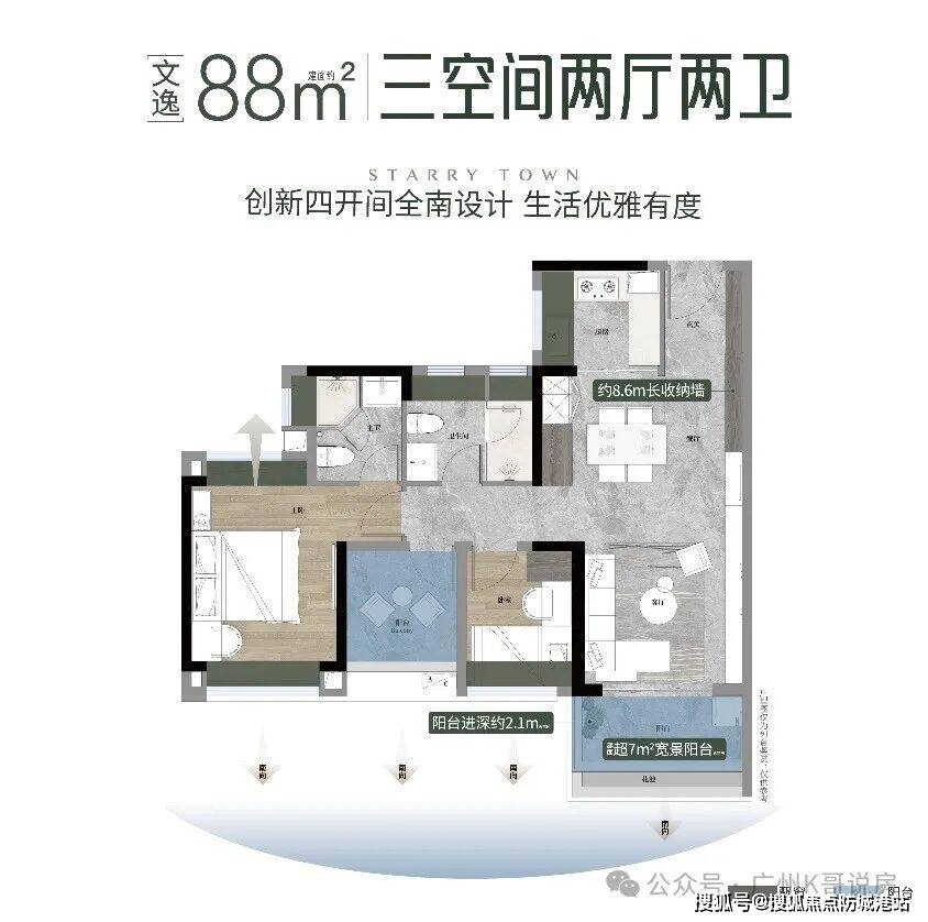 【88㎡ 3空间2厅2卫】:该户型为刚需首选户型,罕见四面宽小户型设计,整体朝南,采光通风效果极佳,三卧室均朝南,拥有超11米景观线,让阳光充分洒满房间的每一个角落,与阳光无限亲近,提升居住舒适度。户型布局紧凑合理,动静分区明确,客厅、餐厅相连,打造开阔的活动空间,适合家人日常活动、接待亲友;两个卫生间设计,避免了家人日常使用的拥挤,提升了生活便利性。同时,户型注重精细化收纳,打造了约10米收纳墙,能够藏纳全家人的爱好和杂物,让房间保持整洁有序,充分满足刚需家庭的居住需求,性价比极高。