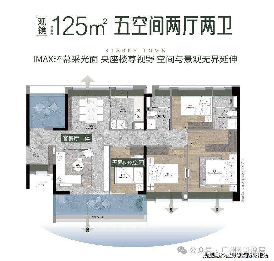 【125㎡ 5空间2厅2卫】:该户型为大户型,适合改善型大家庭居住,4.5开间朝南,客餐厅南北对流,打造舒适阳光宅,采光通风效果极佳,室内空间开阔明亮,给人一种通透大气的感觉。餐客一体化设计,打造百变大方厅,空间宽敞,能够满足家人日常活动、休闲娱乐、接待亲友等多种需求,同时,可根据需求划分出不同的功能区域,灵活多变。双面宽观景阳台,南北满飘窗,不仅提升了户型的实用性,还增加了使用面积,视野开阔,能够欣赏到社区内外的美景;高使用率设计,充分利用每一寸空间,让居住更加舒适、便捷,适合五口之家或有改善需求的大家庭居住。