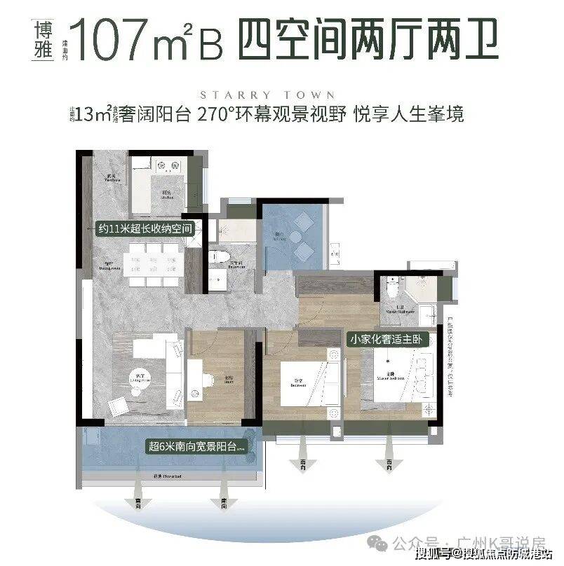 【107㎡B 4空间2厅2卫】:该户型同样为改善型户型,采用四开间朝南设计,经典竖厅布局,动静分区明确,休息区与活动区分开,避免了相互干扰,提升了居住舒适度。多功能空间尺度宽阔,可根据家庭需求改造为书房、儿童房或储物间,灵活适配二胎家庭或有老人同住的家庭。户型注重精细化收纳,打造了超11米收纳墙,能够充分满足家人的储物需求,让房间保持整洁有序;主卧自带独立衣帽间,空间宽敞,能够容纳女主人的衣物、配饰等,满足女性业主的需求,提升居住幸福感。