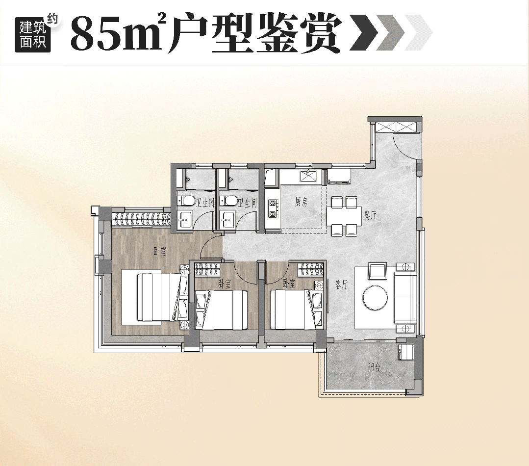 建面约85㎡户型:该户型是西部少有的非超高层+南向三房两卫设计,主打改善刚需定位,适合四口之家居住。户型分为传统竖厅和南北对流两个版本,但均做到三房两卫,并且所有卧室朝南,采光效果极佳,每一个房间都能享受充足的阳光;客厅宽敞明亮,连接南向阳台,阳台视野开阔,可欣赏社区景观或江景,同时用于晾晒和休闲;主卧配备独立卫生间和飘窗,私密性强,居住舒适度高,次卧空间适中,可作为儿童房或老人房,书房空间可灵活改造,满足业主不同的使用需求;厨房采用U型设计,操作便捷,可容纳多人同时烹饪;两个卫生间均采用干湿分离设计,方便业主日常使用,避免高峰期拥堵。该户型兼顾实用性与舒适性,是改善刚需人群的优选。