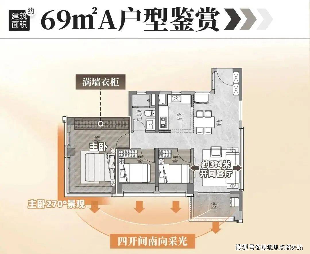 建面约69㎡户型:该户型是广州西部稀缺的极小户型,也是总价最低的新规三房,主打刚需定位,适合三口之家或单身贵族居住。户型设计科学合理,做到南北对流,并且拥有双面江景,这在同面积段户型中十分罕见,江景视野极佳;布局紧凑,没有浪费空间,客厅连接南向阳台,采光和通风效果良好,阳台可用于晾晒、休闲,同时欣赏江景;三个卧室均配备飘窗,增加使用空间的同时,提升采光效果,其中主卧空间宽敞,可摆放衣柜、梳妆台等家具,保障居住舒适度;厨房采用L型设计,操作空间充足,方便日常烹饪;卫生间干湿分离,避免潮湿困扰,提升使用舒适度。该户型性价比极高,是刚需人群跻身白鹅潭豪宅区的最低门槛选择。